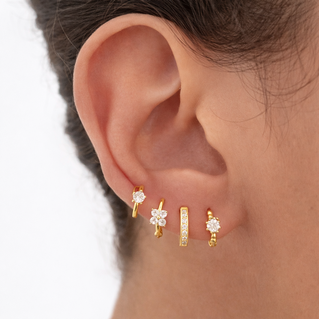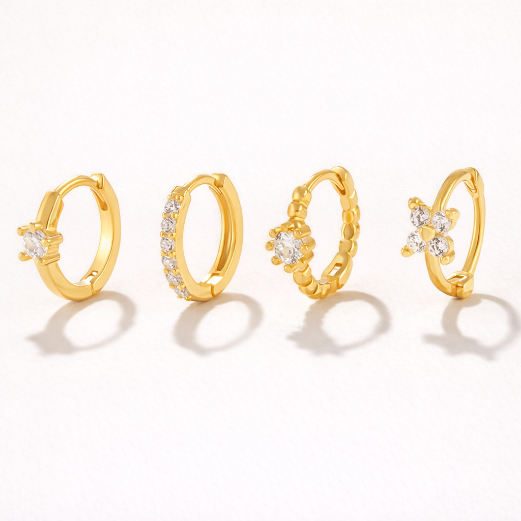 Elevate your ear game with the Desiree SET—a fabulous quartet of stainless steel hoops that mean serious sparkle. Each pair features dazzling white zirconia stones that catch the light like tiny diamonds, giving you that luxury look without the luxury price tag. Mix, match, and stack to your heart's content. Durable, hypoallergenic, and ready to become your go-to rotation. Four pairs, infinite styling possibilities!