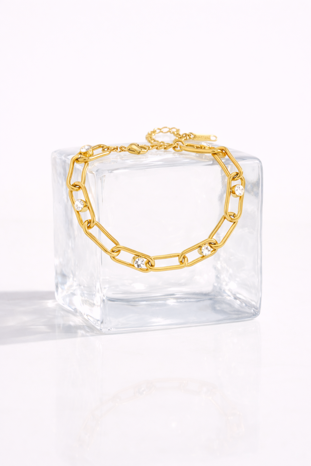 Ce bracelet à maillons dorés allie un design audacieux à un éclat subtil pour un style raffiné et moderne. Composé de maillons rectangulaires allongés ornés de pierres transparentes, il offre un équilibre parfait entre originalité et sophistication.