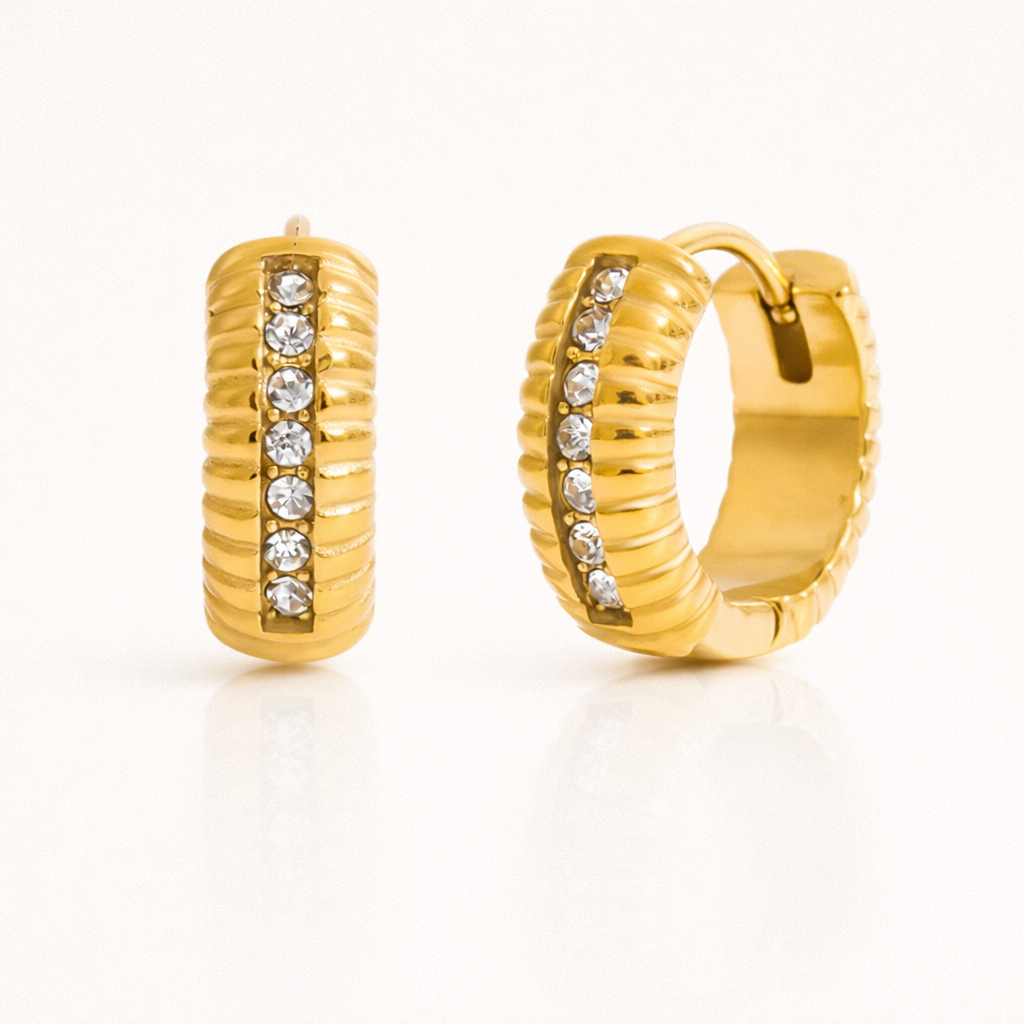 Ces boucles d'oreilles créoles côtelées dorées offrent un équilibre parfait entre élégance et praticité au quotidien. Leur finition texturée et sculpturale, ornée d'une rangée verticale de cristaux scintillants, capte magnifiquement la lumière tout en restant intemporelles et polyvalentes.