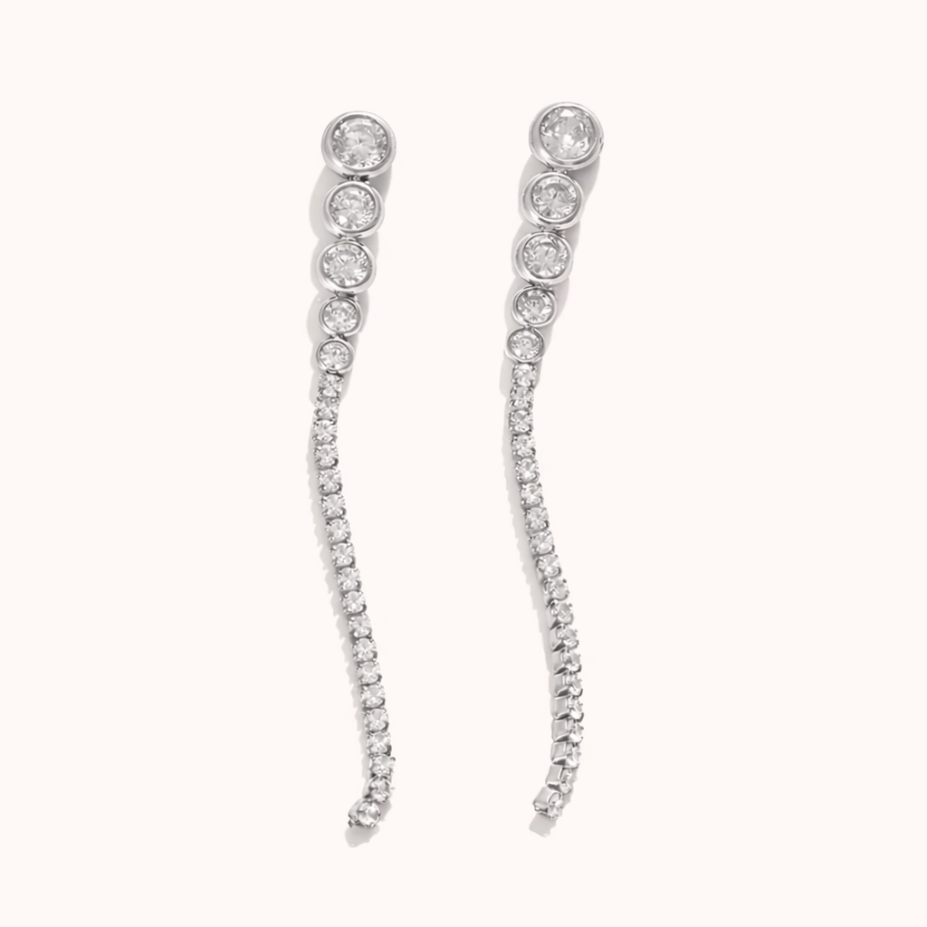 Geef je feestelijke look een sprankelende twist met de Odette oorbellen. Deze opvallende oorbellen, gemaakt van strak roestvrij staal en bezaaid met witte zirkonia's, geven speelse elegantie aan elke outfit. Perfect om alle aandacht te trekken en de dansvloer te laten schitteren!