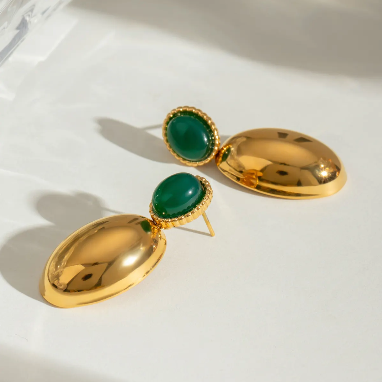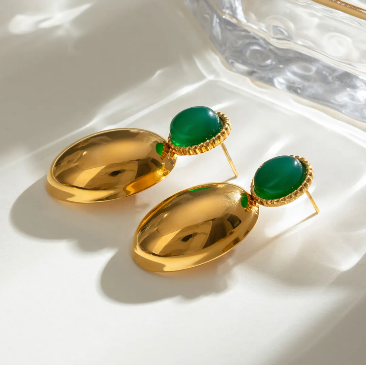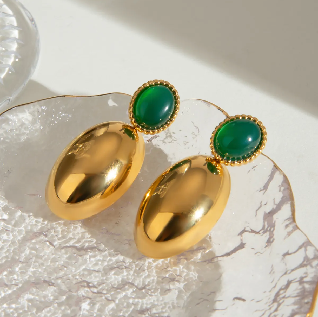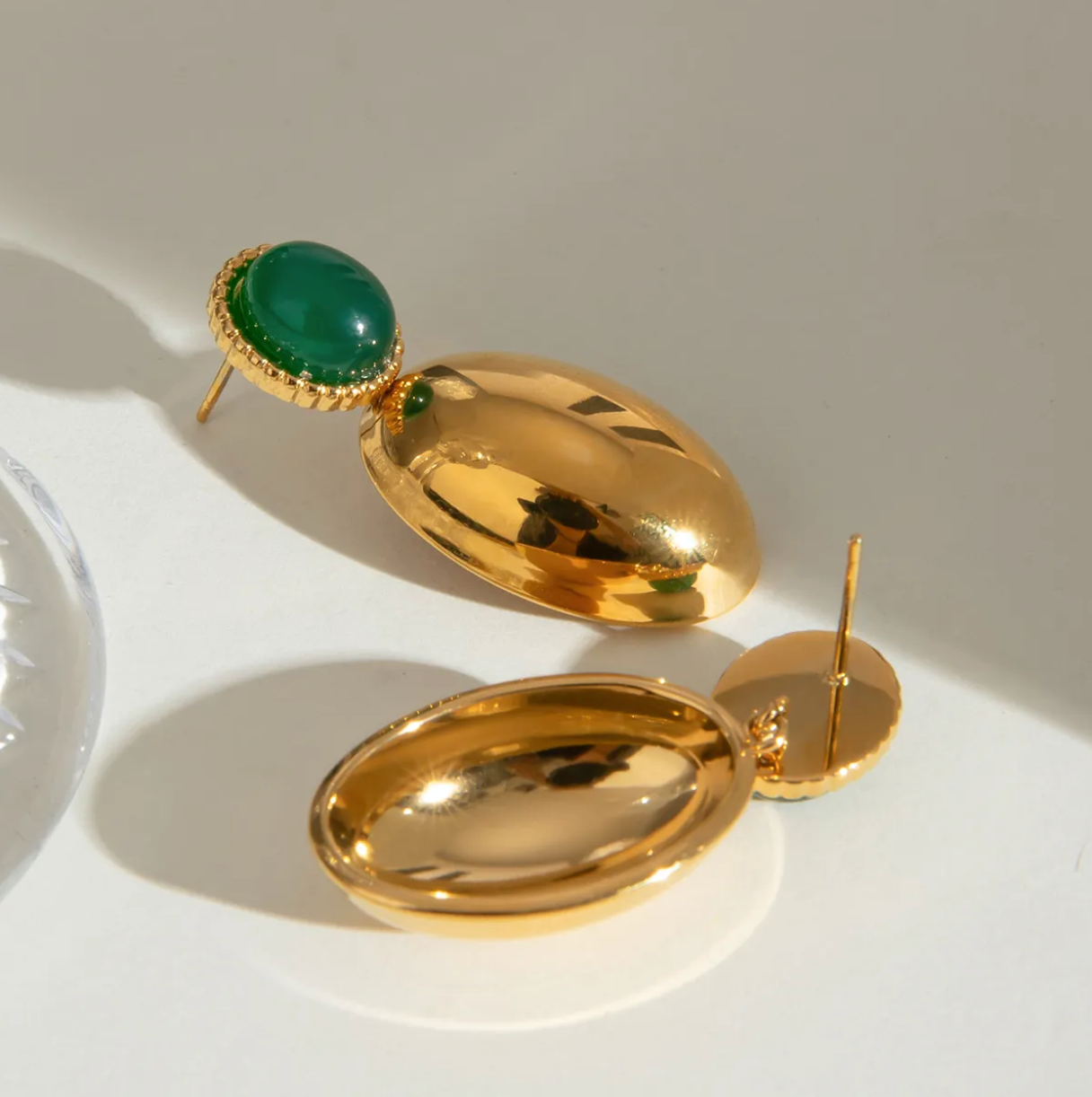 Rock a vintage look with a modern twist with our Elodie EARRINGS. Made of stainless steel, these statement earrings feature a stunning green stone detail. Stand out from the crowd and add a touch of quirkiness to your style. (No need for a time machine to rock these vintage vibes!)