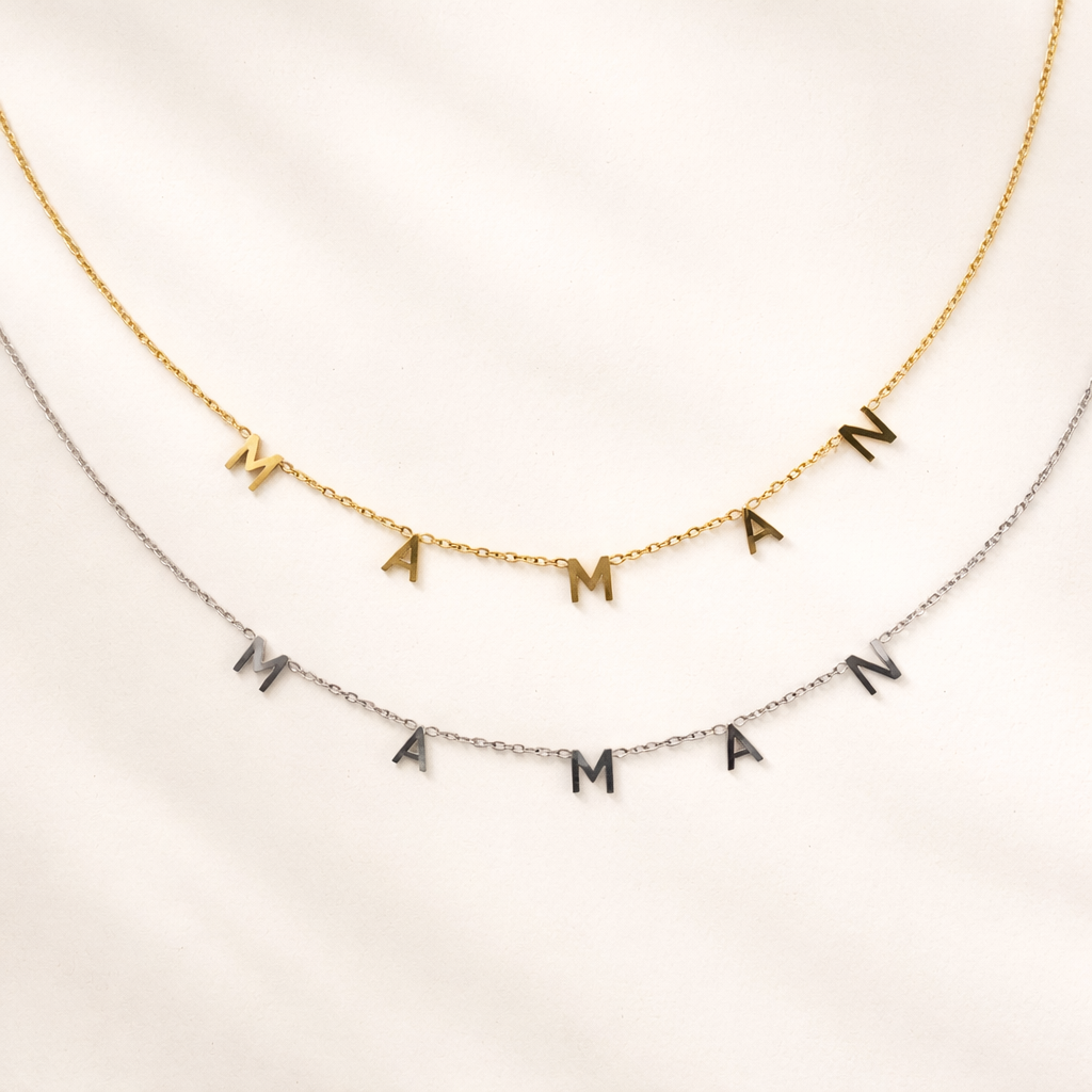 Add a touch of playful elegance with the Maman NECKLACE. Made of stainless steel, this necklace features the word "maman" written in a delicate font. The perfect gift for any stylish mom, this necklace adds a personal and chic touch to any outfit.